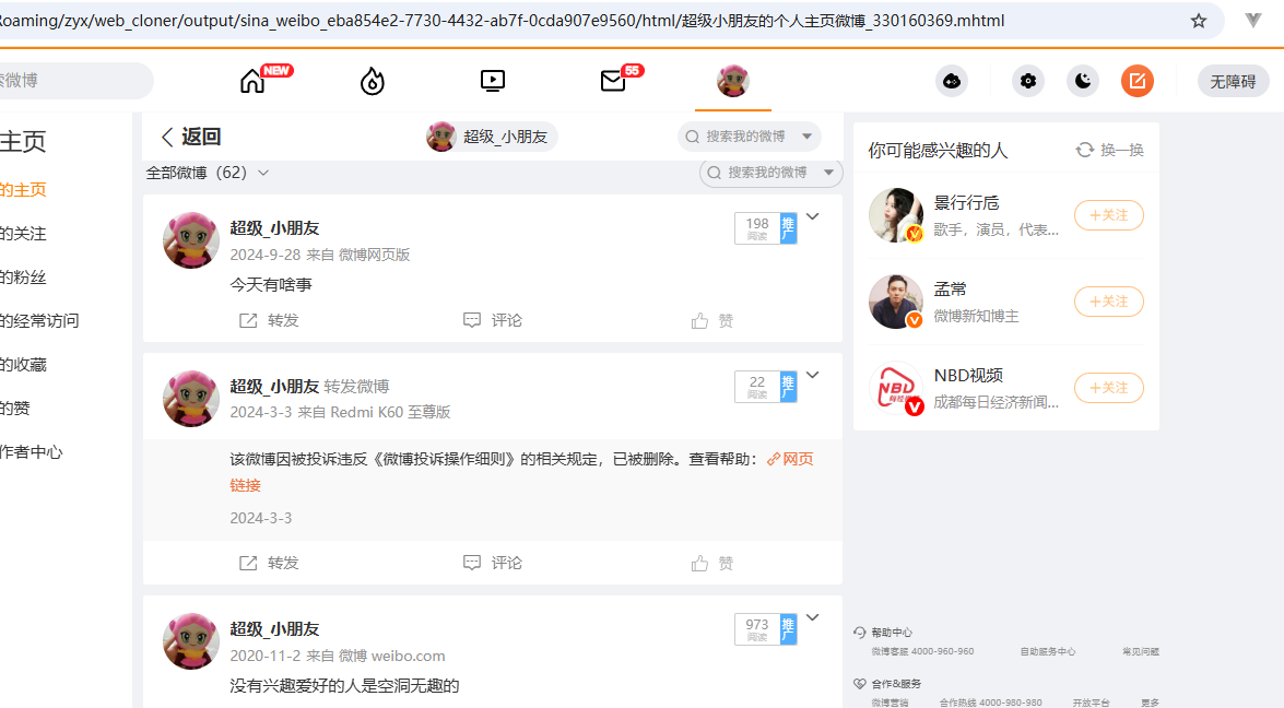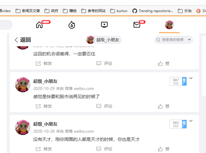 新浪微博有点特殊,全部内容都在同一个页面中。内容是通过一个动态列表展示