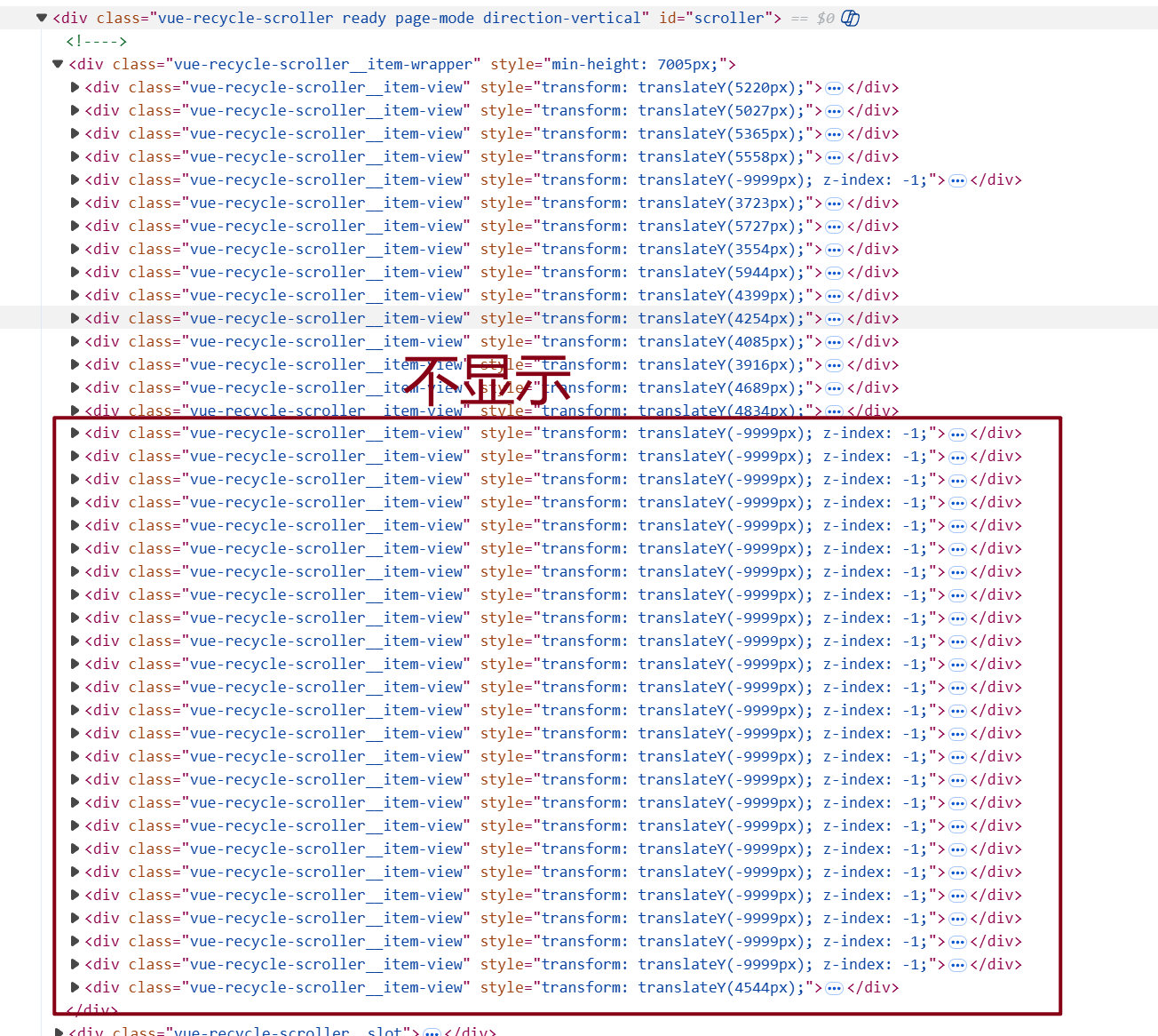 虽然上面的方法让所有节点都生成了,但是动态列表会控制只显示能看到的,看不到的隐藏了,如下图。