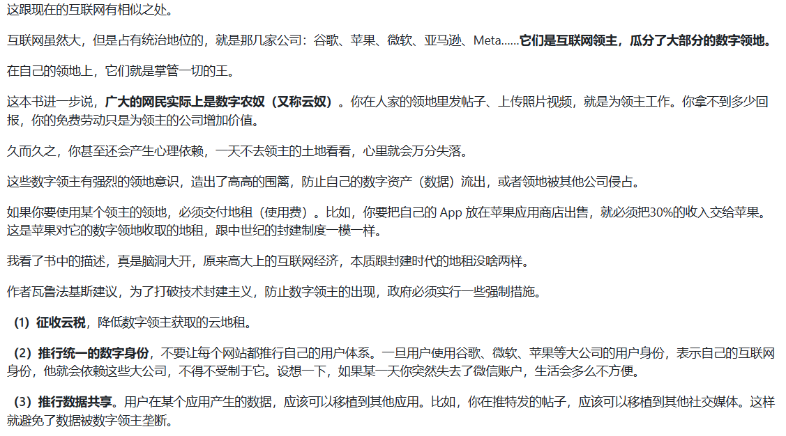 最近看了一篇“阮一峰”的文章,里面说到一个观点叫互联网封建主义,说现在的互联网被一些大的平台垄断了。网民自以为是互联网的主人,其实只是各大平台的免费奴隶。不论你在微信里发表文章,还是在抖音里发布视频,都是给平台打工,被平台榨取价值。而且各大平台都有很强的领地意识,为了防止这些免费奴隶(用户)叛逃到其它平台,他们会设置各种账号壁垒,比如:不让你轻易的带走你的个人资料,不与其它平台共享资源。这种情况像极了封建社会地主和农民的关系。只不过是现在转换了场景而已。