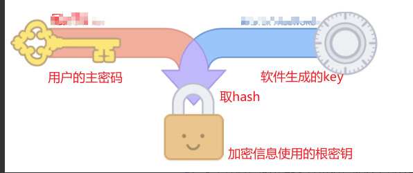 1、软件生成一个复杂的key(25个随机字符)和用户的主密码拼在一起生成一个新密码,可以叫根密码。