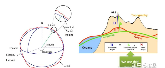 (3):大地高度h是过用户点P到基准椭球面的法线距离,基准椭球面以内为负,以外为正。