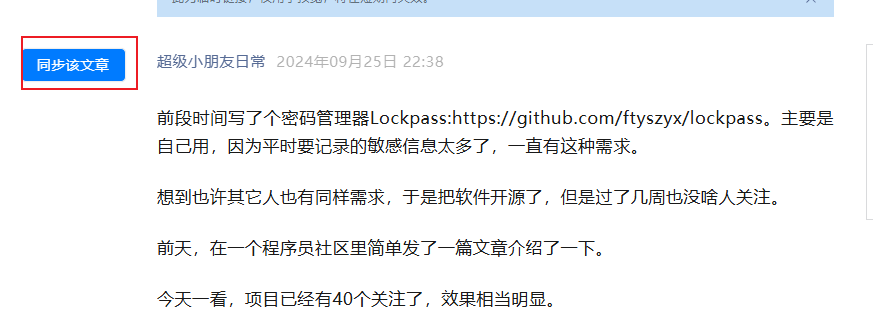 - 用户在飞书上写文章,在飞书打开文章页面时,会插入一个 同步按键