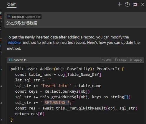 ctrl+L:和ai聊天,让ai给出代码片段。